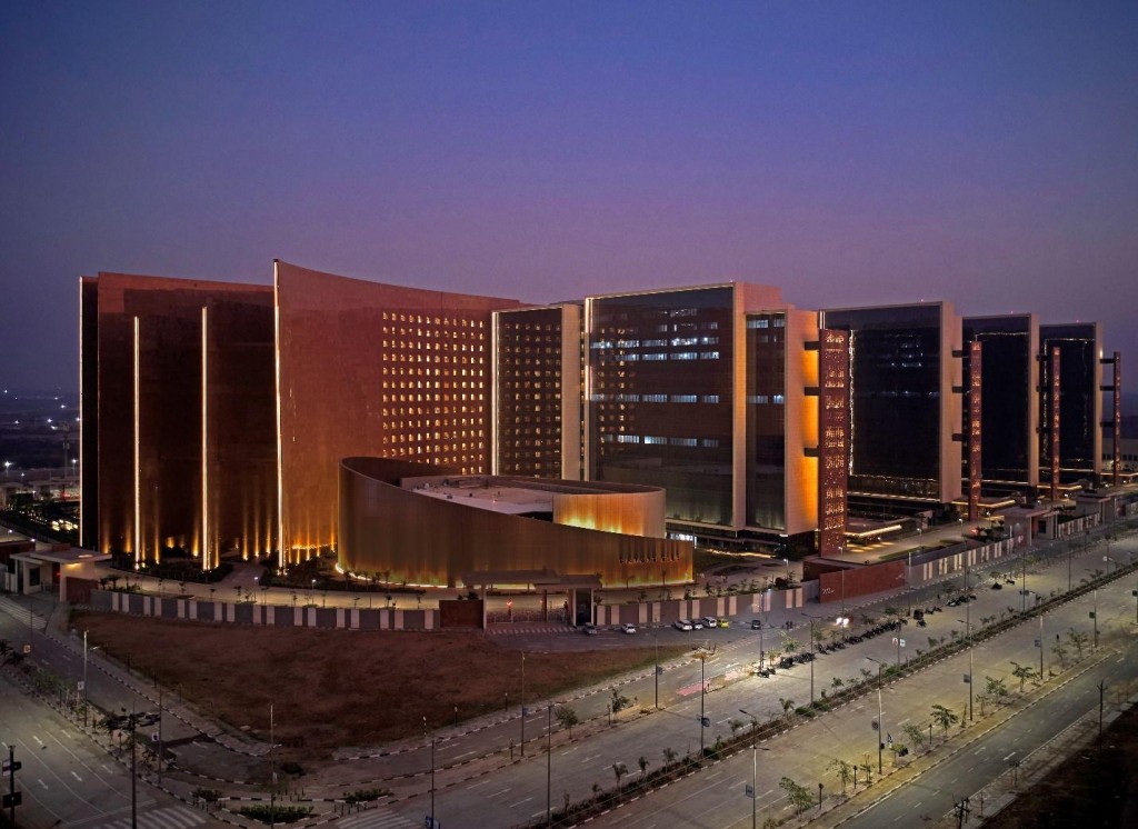 The X-shaped master plan features 100-meter-long wings rotated 22.5 degrees off the Tropic of Cancer, enabling 90% of workspaces to receive daylight from two sides. Multi-colored vertical louvers inspired by Indian classical music notes regulate solar gain and enliven the facade.