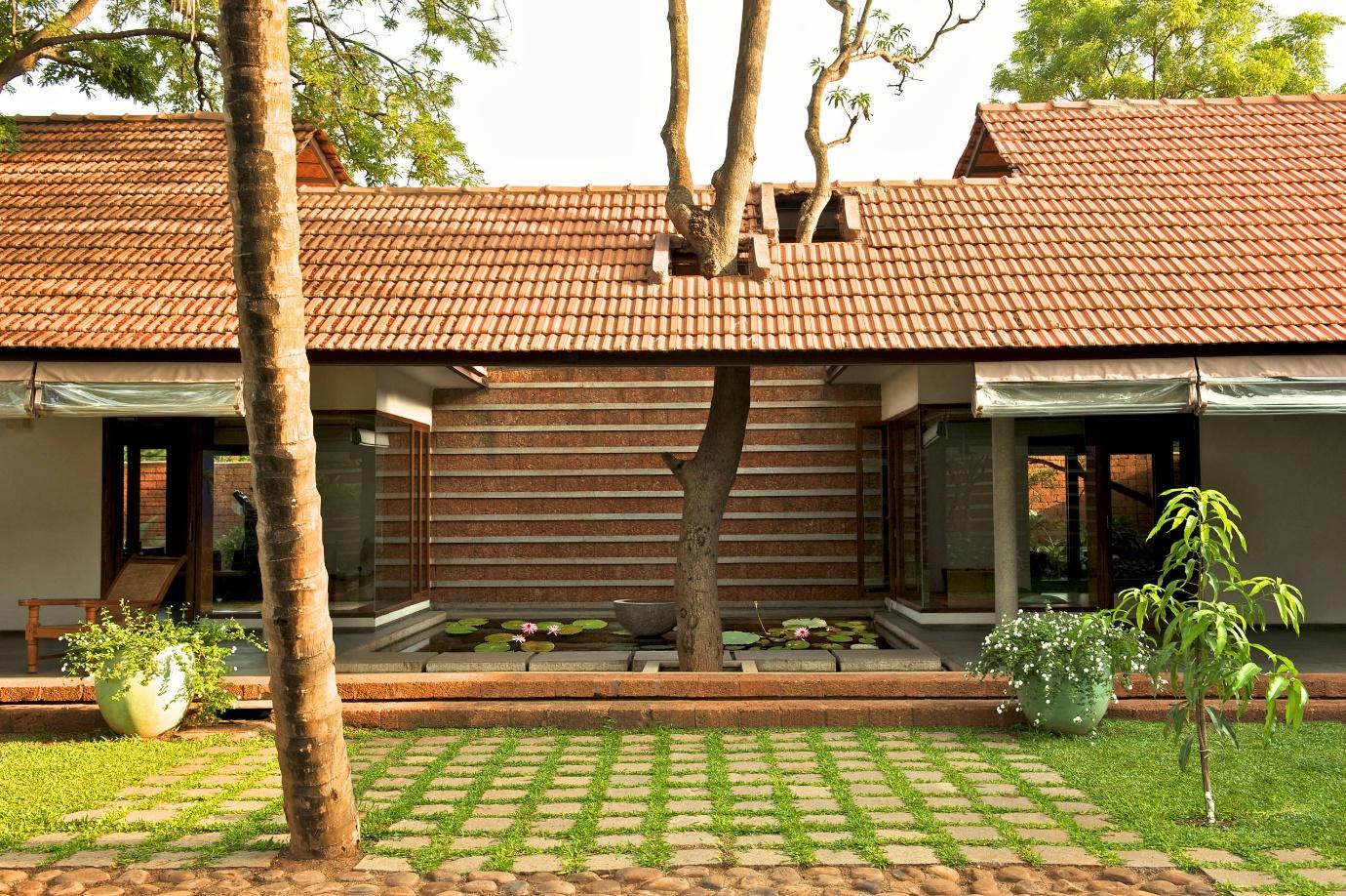 In Kerala, the nalukettu courtyard homes use timber and laterite with sloped roofs to manage heavy monsoons.