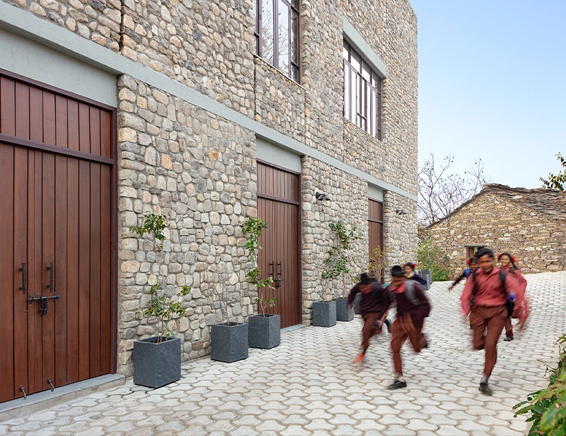 The design works with, not against, its fragile context. Respecting the footprint of the earlier structure, the building adapts to the terrain, resources, and budget while minimizing ecological impact. Inspired by the Garhwali kholi, a traditional rectilinear house form, the facility is oriented east–west and bisected by a central entry. Cooler functions such as grinding, storage, and packaging occupy the lower level, while heat-intensive processes are placed above. A butterfly roof, recalling vernacular forms, maximizes cross ventilation, clerestory lighting, and thermal comfort. With 80% of interiors naturally daylit, the workplace reduces dependence on artificial systems while maintaining healthy working conditions.