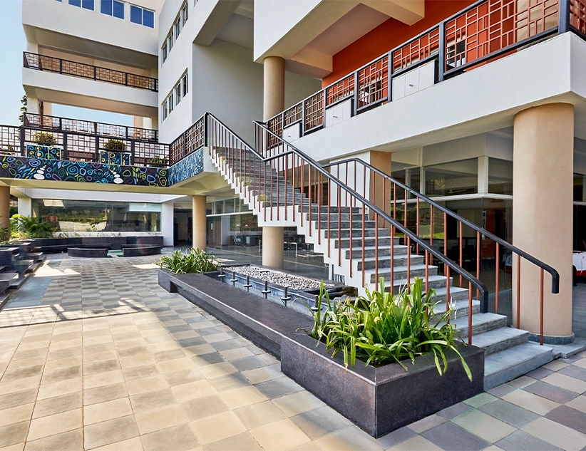 Climate responsiveness shapes both form and experience. Concrete jaalis, angled louvers and solid panels protect interiors from heat while enabling year-round use of courtyards, verandahs and terraces. Lower-level courtyards are programmatically distinct, while upper terraces function as outdoor classrooms. An earth-banked underbelly reduces heat island effect and supports evaporative cooling, maintaining internal temperatures around 27 degrees Celsius even during peak summers. This underbelly also acts as the campus social core, housing exhibitions, food courts, bookstores and informal learning zones.