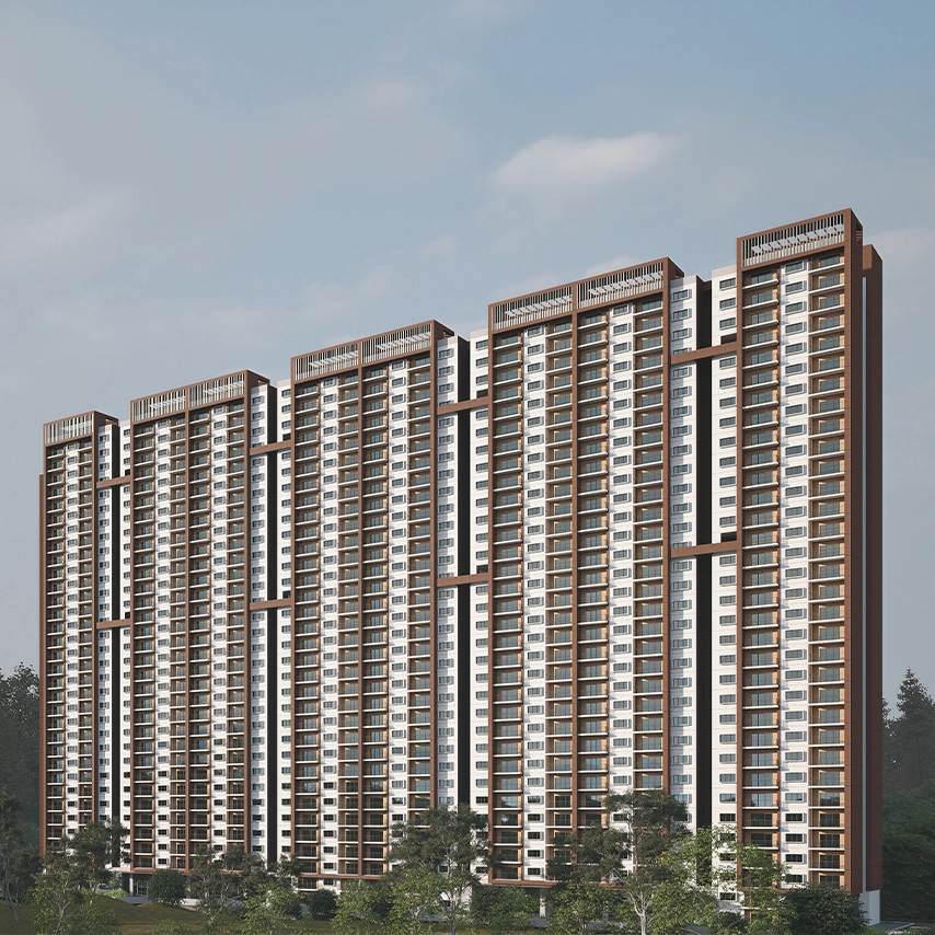 YOO One is situated in Mohammed Wadi, Pune, on a site that rises above its surroundings and opens onto expansive green views. Framed by the Anand Van 4 forest to the north and east, and by lower-rise residential fabric to the south and west, the project derives its identity from this charged meeting of city and landscape. A narrow entrance gives way to a broader site oriented toward the forest, allowing the development to turn outward to distant views while establishing a more sheltered and inwardly coherent community realm.
